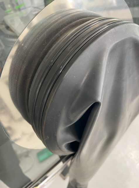 最近の事例を1つ。写真はグローブボックスのブチルゴム手袋です。7インチのカフサイズですが、ある日Oリングが飛んでいることに気づく。見ればすべてのOリングがひび割れている。さてどうしよう。こんな時にもちろんメーカーに見積もりして、専用の物を買うという手段が普通の流儀でしょうが、時間もかかるし・・。私は採寸してモノタロウで代替になりそうなのを買ってしまう性格です。翌日に届くのでとても便利です。